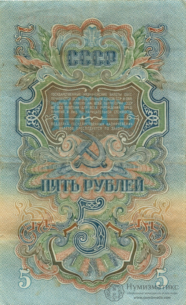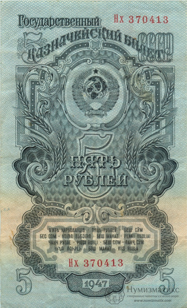 5 рублей 1947 года Нх 370413 — СССР — Банкноты СССР
