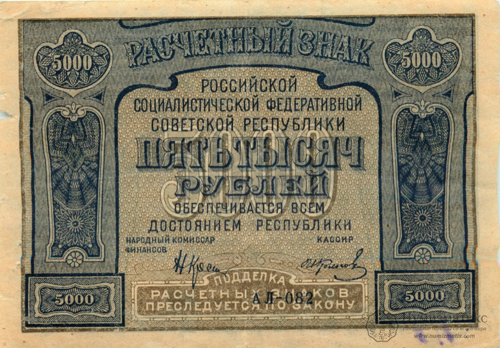 5000 рублей 1921 года АЛ-082 — РСФСР — Банкноты СССР