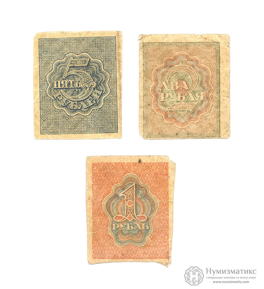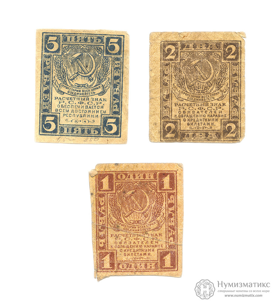 Набор из трех банкнот СССР (1 рубль, 2 рубля и 5 рублей)