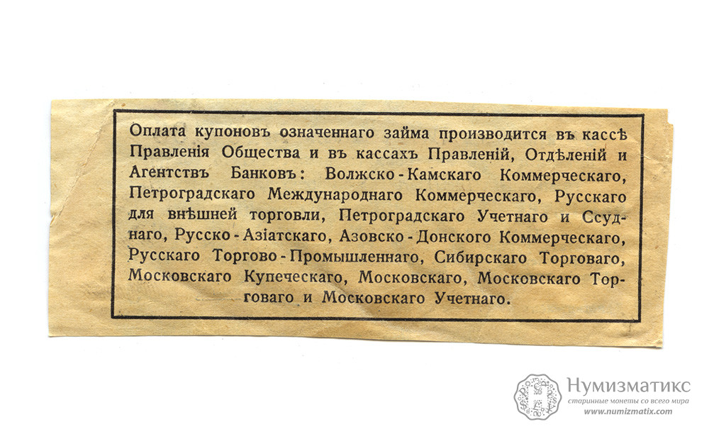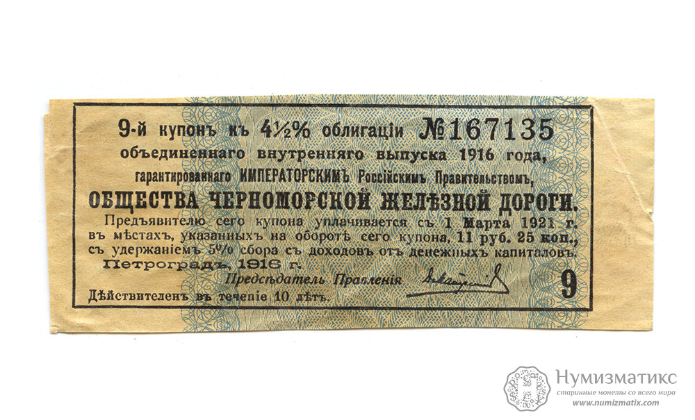 Купон к облигации 1916 года, гарантированного Императорским Российским Правительством общества Черноморской железной дороги