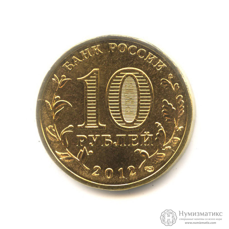 В центре диска — обозначение номинала монеты «10 РУБЛЕЙ». Внутри цифры«0» — скрытые, видимые поочередно при изменении угла зрения изображения цифры «10» и надписи «РУБ». По окружности вдоль канта — надписи, вверху: «БАНК РОССИИ», внизу — дата: «2012», слева — стилизованное изображение лавровой ветви, справа — дубовой.