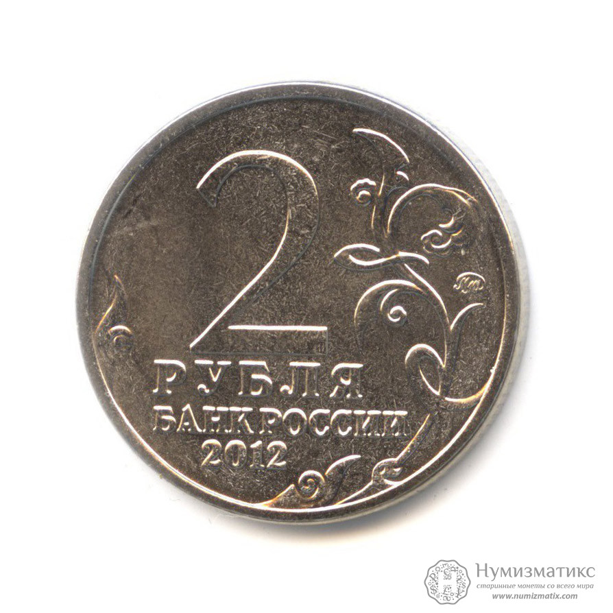 В центре диска — обозначение номинала монеты в две строки: «2 РУБЛЯ», ниже — надпись: «БАНК РОССИИ», под ней — год чеканки: «2012», слева и справа — стилизованная ветка растения, справа у канта — товарный знак монетного двора.