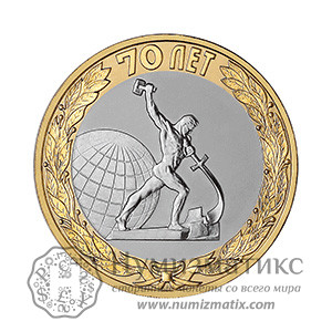 В центре диска — изображение скульптуры Е. В. Вучетича «Перекуем мечи на орала», слева — очертания Земного шара, вдоль канта на кольце — лавровый венок и надпись верху: «70 ЛЕТ».