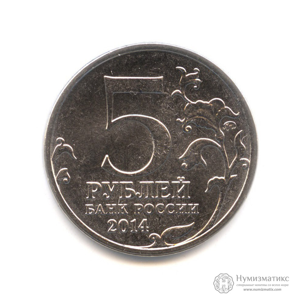 В центре диска — обозначение номинала монеты: «5 РУБЛЕЙ», ниже — надпись: «БАНК РОССИИ», под ней — год чеканки: «2014», слева и справа — стилизованная ветка растения, справа у канта — товарный знак монетного двора.