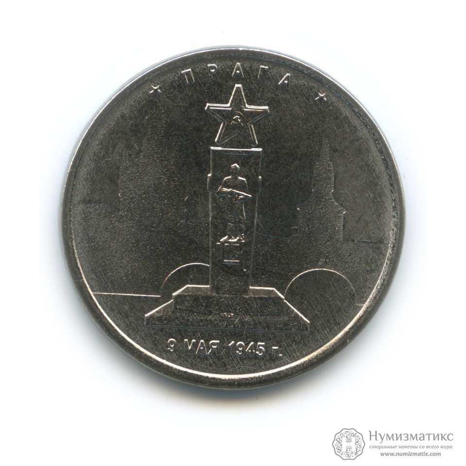 В центре диска изображение Памятника советским воинам, установленного на Ольшанском кладбище в Праге, на фоне контурных изображений архитектурных сооружений Праги, ниже — горизонтальная надпись: «9 МАЯ 1945 г.», вверху вдоль канта — надпись: «ПРАГА».