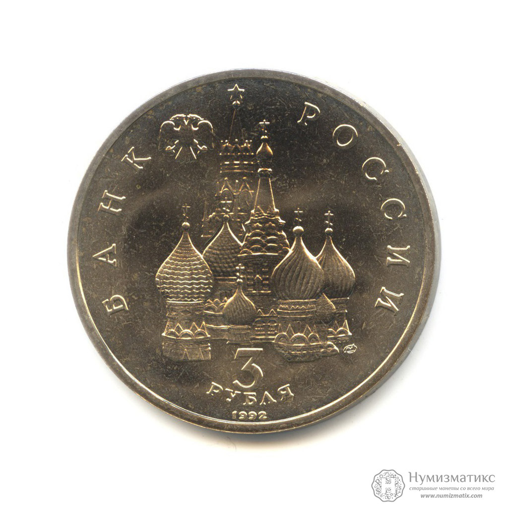 В центре диска — рельефное изображение куполов собора Покрова на Рву на Красной площади и Спасской башни Московского кремля, слева вверху — двуглавый орёл с опущенными крыльями, под собором справа — товарный знак монетного двора, внизу в центре в три строки — номинал и год выпуска: «3 РУБЛЯ 1992»; вдоль канта по окружности — надписи, слева: «БАНК», справа: «РОССИИ».