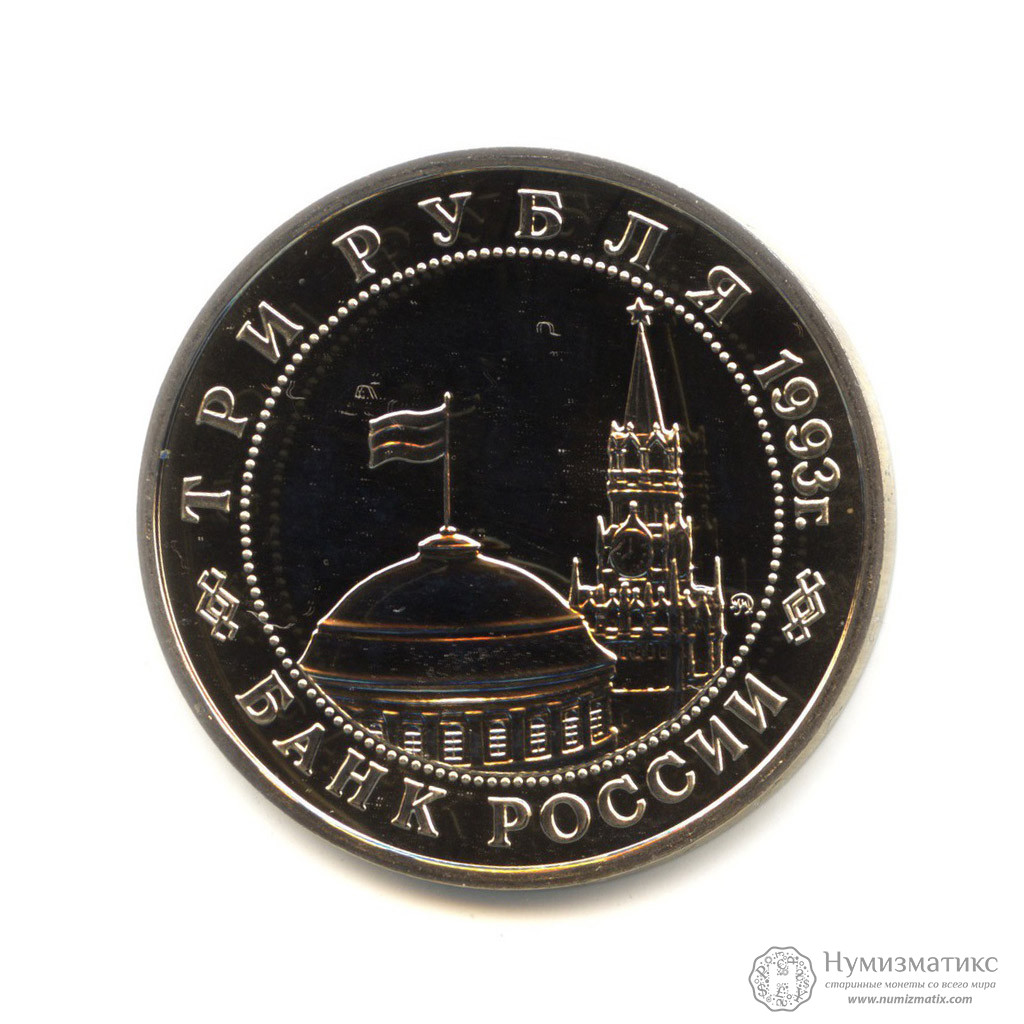 В центре диска — изображения купола здания Сената и Спасской башни Московского Кремля, справа от них — товарный знак монетного двора. По окружности надписи, обрамлённые кругом из точек: вверху — «ТРИ РУБЛЯ 1993 г.», внизу — «БАНК РОССИИ».