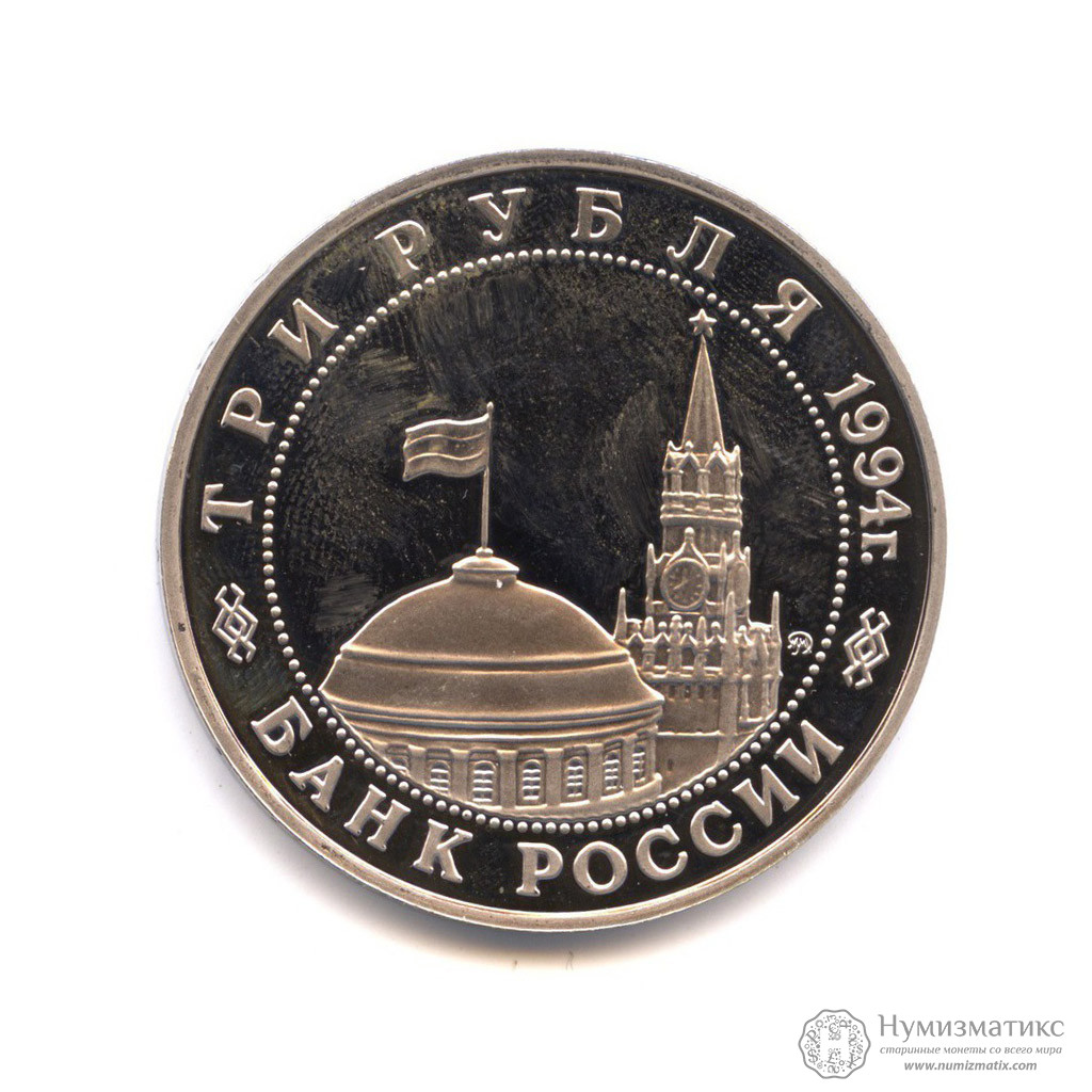 Изображения фрагмента здания Кремлёвского дворца, Спасской башни Московского Кремля и товарный знак монетного двора, по окружности надписи,разделённые орнаментом: вверху — «ТРИ РУБЛЯ» «1994 г.», внизу — «БАНК РОССИИ».