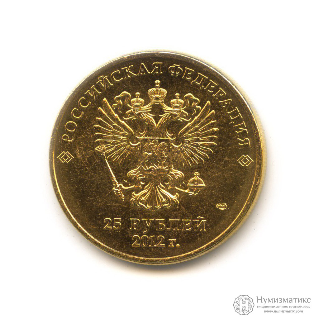 в центре диска — рельефное изображение Государственного герба Российской Федерации, над ним у канта надпись полукругом «РОССИЙСКАЯ ФЕДЕРАЦИЯ», внизу под гербом в две строки — номинал монеты: «25 РУБЛЕЙ» и год выпуска: «2012 г.», справа — товарный знак Санкт-Петербургского монетного двора.