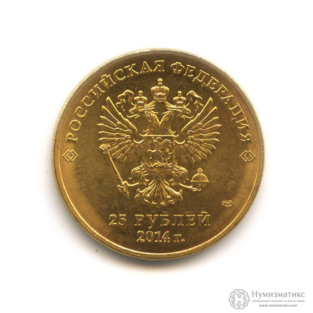 на матовом поле диска — рельефное изображение Государственного герба Российской Федерации, над ним вдоль канта — надпись полукругом: «РОССИЙСКАЯ ФЕДЕРАЦИЯ», внизу под гербом в центре в две строки — номинал монеты: «25 РУБЛЕЙ» и дата: «2014 г.», справа — товарный знак монетного двора.