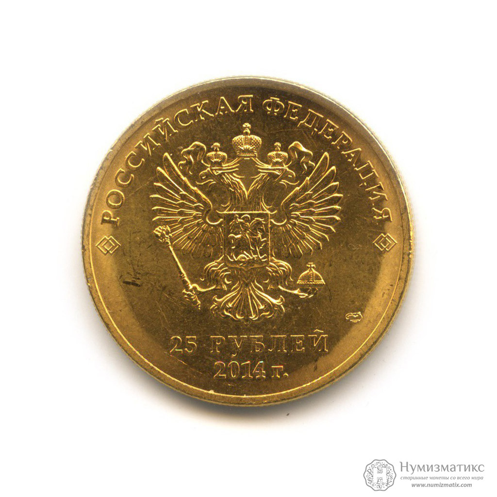 на матовом поле диска — рельефное изображение Государственного герба Российской Федерации, над ним вдоль канта — надпись полукругом: «РОССИЙСКАЯ ФЕДЕРАЦИЯ», внизу под гербом в центре в две строки — номинал монеты: «25 РУБЛЕЙ» и дата: «2014 г.», справа — товарный знак монетного двора.