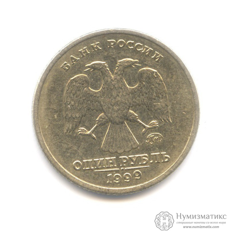 в центре диска — эмблема Банка России (двуглавый орёл художника И. Билибина), над ней — надпись полукругом «БАНК РОССИИ», под ней номинал — «ОДИН РУБЛЬ», подчёркнутый горизонтальной линией, разделённой посредине точкой, внизу — «1999 г.», справа — товарный знак монетного двора.