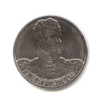 В центре диска - обозначение достоинства монеты в две строки «2 РУБЛЯ», ниже — надпись: «БАНК РОССИИ», под ней — дата «2000», слева и справа — стилизованная ветка растения.