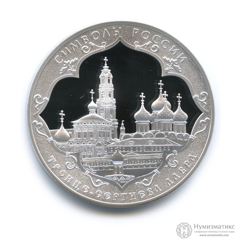 в центре диска в картуше — изображение Троице-Сергиевой Лавры, надписи вдоль канта — вверху: «СИМВОЛЫ РОССИИ», внизу: «ТРОИЦЕ-СЕРГИЕВА ЛАВРА».