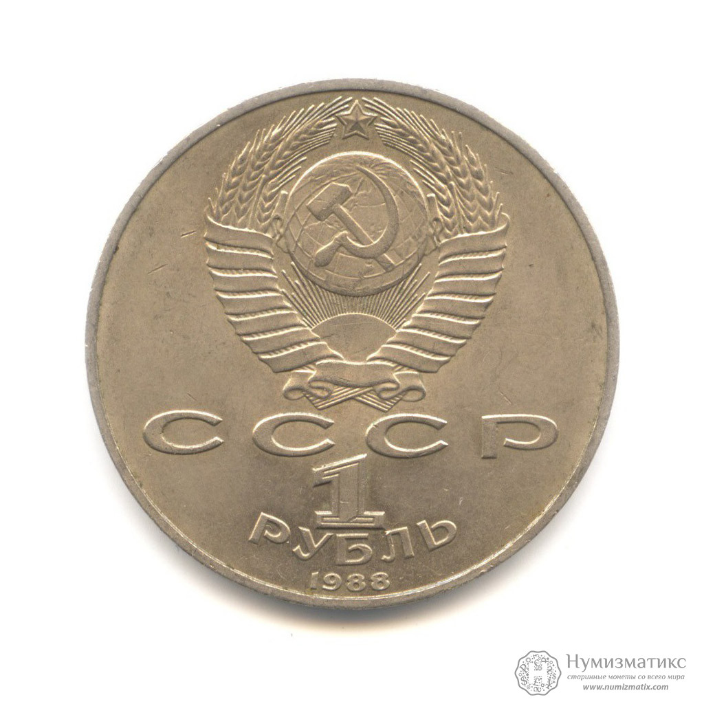 В верхней части изображение Государственного герба Союза Советских Социалистических Республик, под ним надписи: «СССР», в две строки — «1 РУБЛЬ» (слово «РУБЛЬ» расположено полукругом), обозначающая достоинство монеты, и «1988», обозначающая год чеканки. По окружности выступающий кант. Изображение и надписи рельефные.