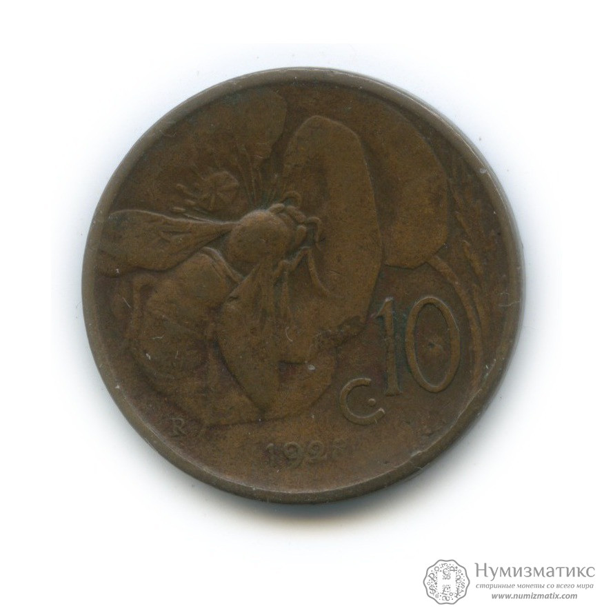 Монета регулярного выпуска «10 чентезимо 1928 года».Король Виктор Эммануил III (1900-1946) (Италия).Медь.