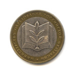 В центре диска — обозначение достоинства монеты «10 РУБЛЕЙ». Внутри цифры «0» — скрытые, видимые поочередно при изменении угла зрения изображения цифры «10» и надписи «РУБ». В нижней части диска — товарный знак монетного двора. В верхней части кольцапо окружности — надпись: «БАНК РОССИИ», в нижней — дата «2004», слева и справа — стилизованные ветви растений, переходящиена диск.