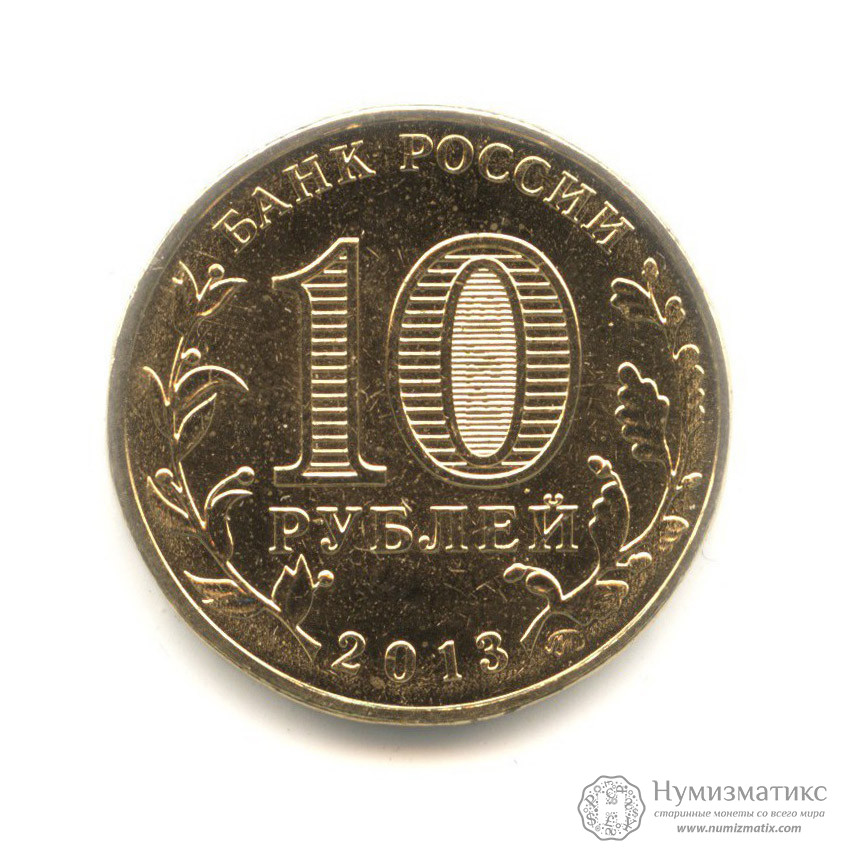 В центре диска — обозначение номинала монеты «10 РУБЛЕЙ». Внутри цифры«0» — скрытые, видимые поочередно при изменении угла зрения изображения цифры «10» и надписи «РУБ». По окружности вдоль канта — надписи, вверху: «БАНК РОССИИ», внизу — дата: «2013», слева — стилизованное изображение лавровой ветви, справа — дубовой.