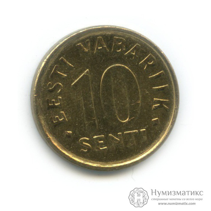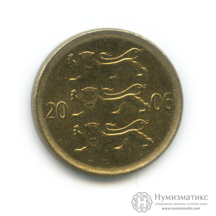 Монета регулярного выпуска «10 сентов 2006 года».2ая Республика (Крона) (1991-2009) (Эстония).Латунь.