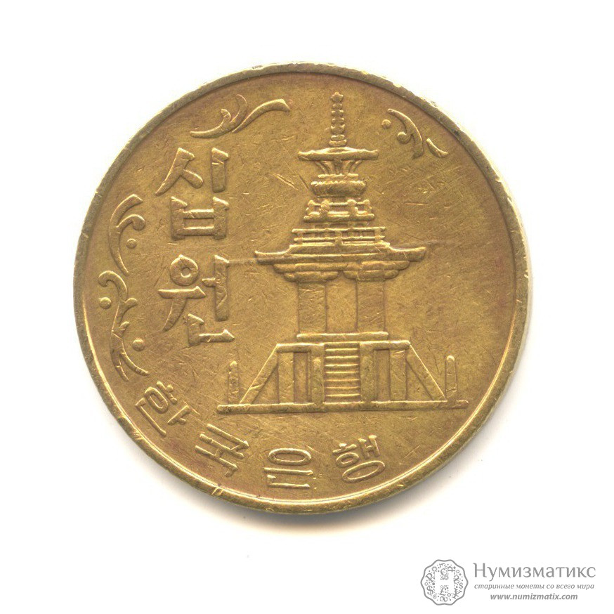 Монета регулярного выпуска «10 вон 1979 года».Республика Корея (1966-1982) (Южная Корея).Латунь.