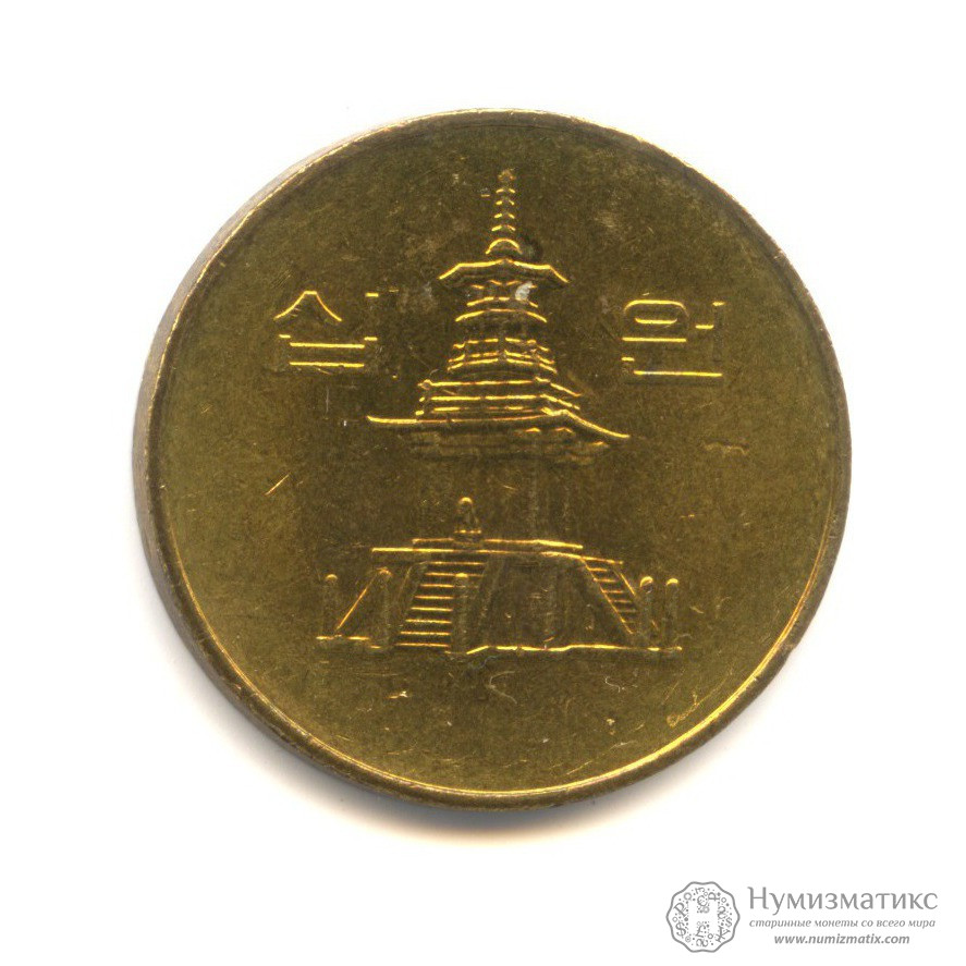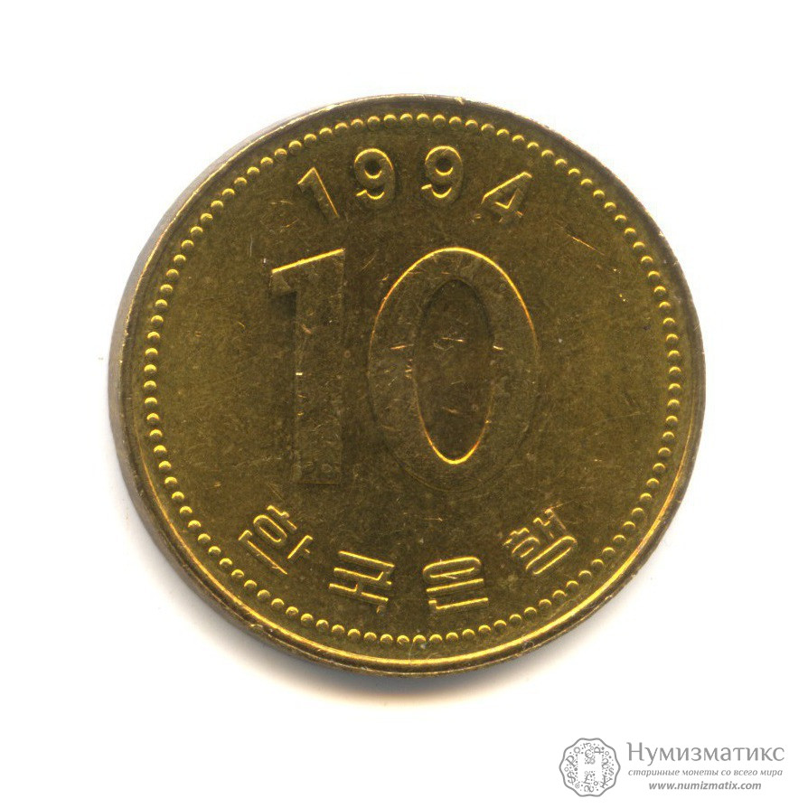 Монета регулярного выпуска «10 вон 1994 года».Республика Корея (1982-2014) (Южная Корея).Латунь.