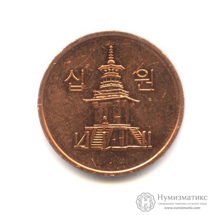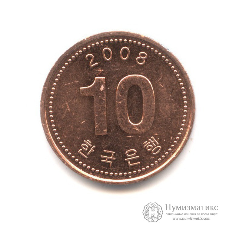 Монета регулярного выпуска «10 вон 2008 года».Республика Корея (1982-2014) (Южная Корея).Алюминий с медным покрытием.