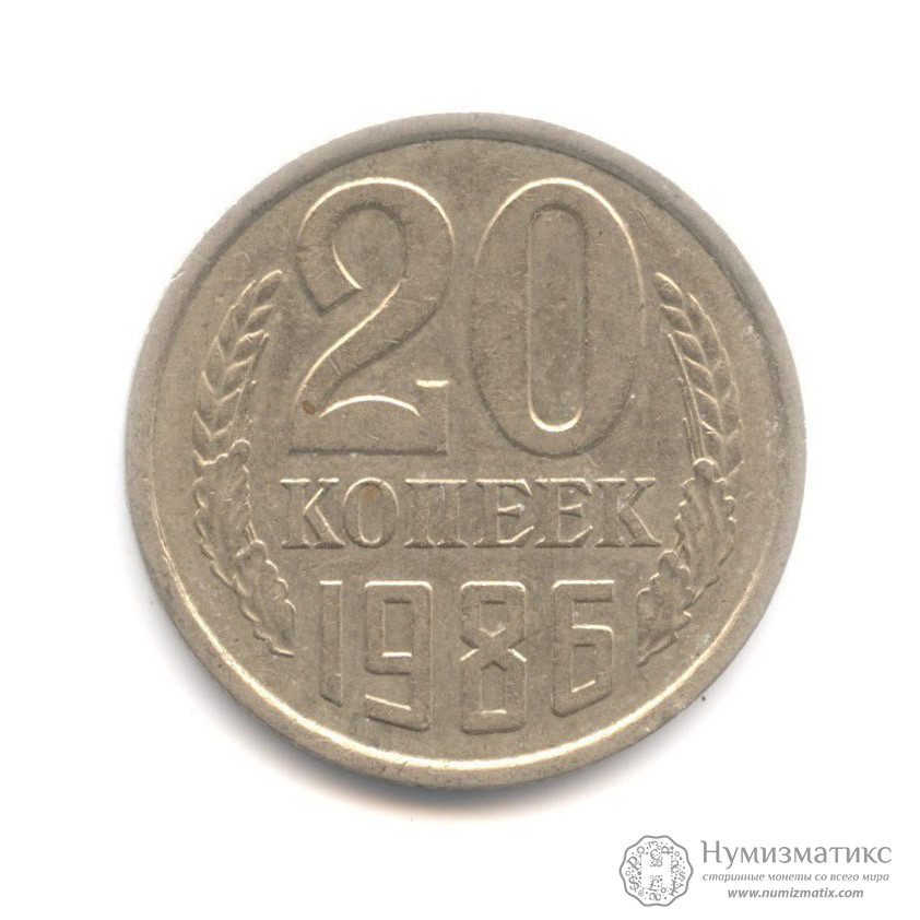 Монета регулярного выпуска «20 копеек 1986 года».Советский Союз (1961-1991) (СССР).Медь-Никель-Цинк.
