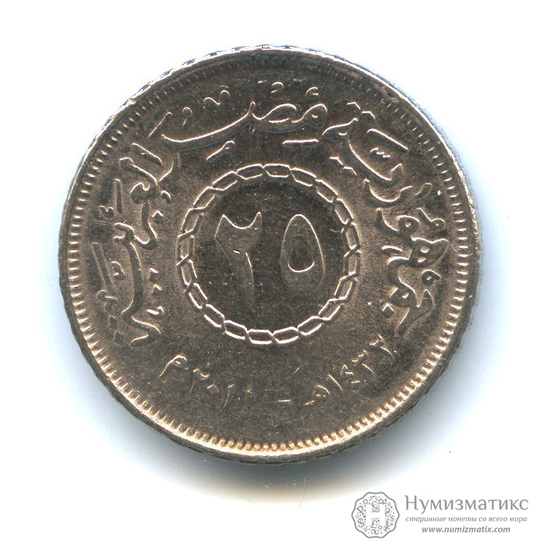 Монета регулярного выпуска «25 пиастров 2011 года».Арабская Республика Египет (1971-2018).Сталь с никелевым покрытием.