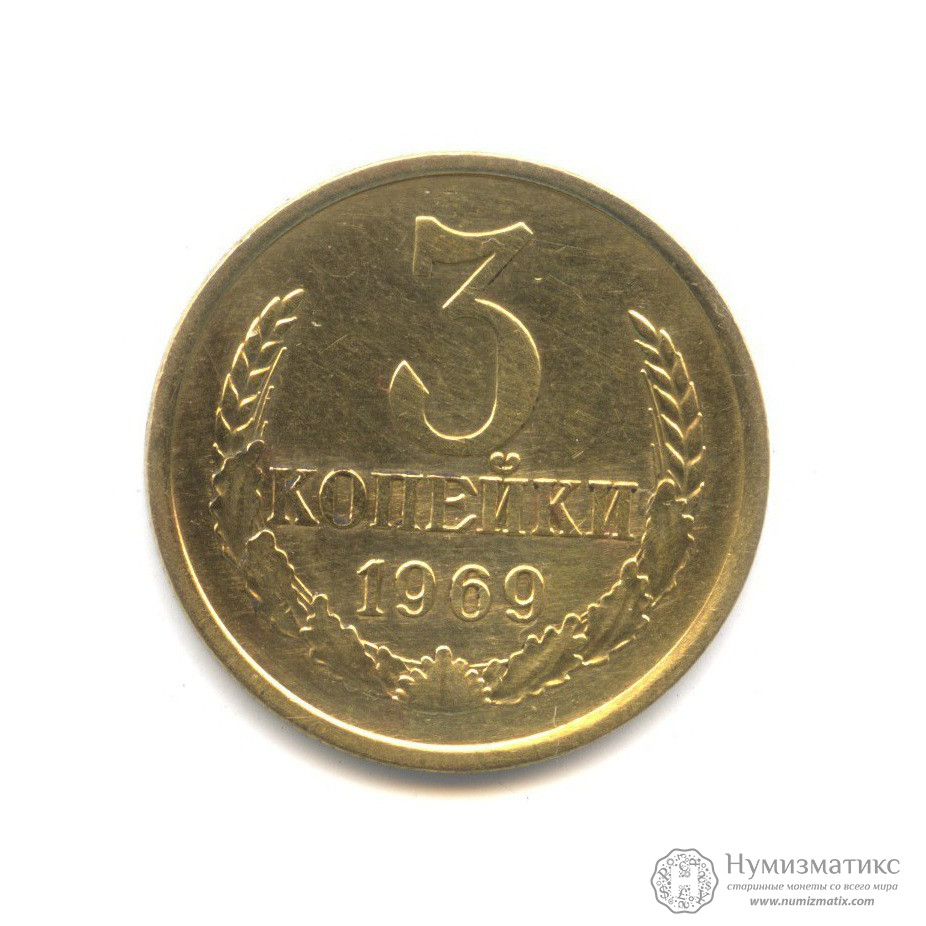 Монета регулярного выпуска «3 копейки 1969 года».Советский Союз (1961-1991) (СССР).Латунь.